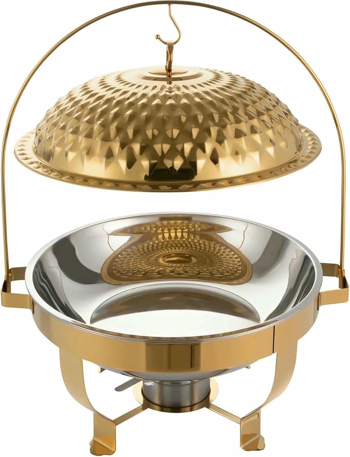 Product details:Material: Stainless steel 201, 410 stainless steel.Color: gold/silver.Request required: yes.Process: electrolysis, polishing.Form: Round.Number of articles: 1.Type of assembly: autonomous, office support.4.76 QT.Dimensions of the food tray (thickness (thicks x h.): 34 x 6.5 cm.Dimensions of the water tank (thickness x h.): 32.7 x 9.5 cm.Gross weight: 7.51 lb.Net weight: 6.39 lb.Packaging dimensions: 45 x 34 x 66 cm.Total height: 57 cm.Product width: 19 cm.Dimensions of the frame (ép. X h.): 38.5 x 20 cm.6.3 liters.Load capacity: approximately 30 kg.Type of cover: dome, open.Total dimensions (L x H): 42 x 56.9 cm.Diameter of the base: 19 cm.Frame height (from bottom to food up): 20 cm.Dimensions of the water tank (thicks x h): 36.1 x 8.9 cm.Dimensions of the dietary tank (thicks x h): 36.1 x 7.5 cm.Gross weight: 8.21 lbs.Net weight: 7.71 lbs.Packaging dimensions: 37.1 x 37.1 x 23.1 cm.8.5 qt.Load capacity: approximately 20 kg.Type of cover: dome, open.Total dimensions (L x H): 44 x 57 cm.Diameter of the base: 19 cm.Framework height (from bottom to support rod): 20 cm.Dimensions of the water tank (thicks x h): 38.1 x 9.4 cm.Dimensions of the food tank (ép. X H): 38.1 x 7.9 cm.Unitaire gross weight: 4 kg.Unitaire net weight: 3.8 kg.Packaging dimensions: 39.1 x 39.1 x 23.1 cm.Delivery content:1 x support frame.1 x lid.1 x hook.1 x food tray.1 x water tray.1 x alcohol fuel tank.Complete accessories for assembly, we will provide you guarantee you optimal quality and impeccable service.