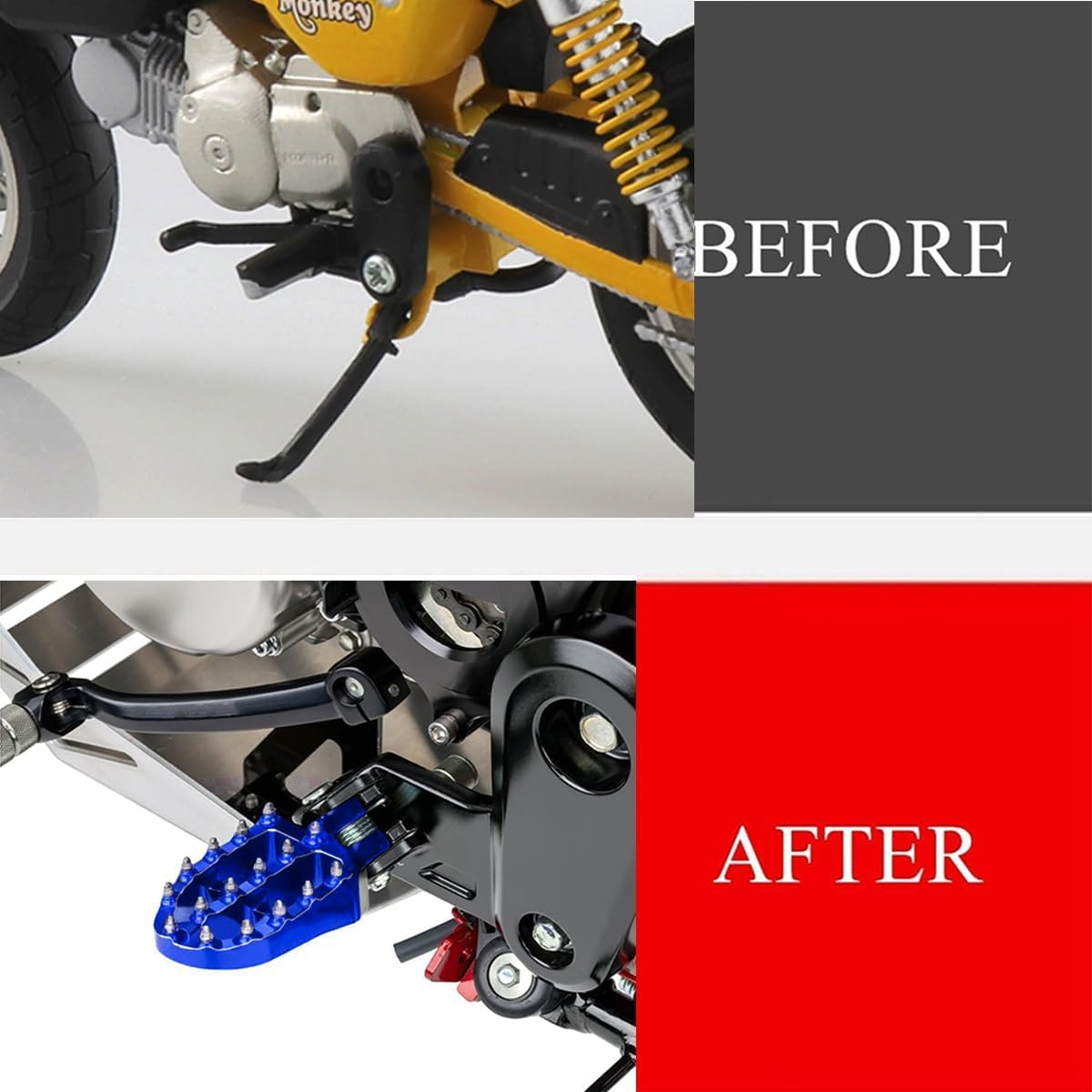 Specification:Material: Made of premium T6 6061 aluminum alloyFoot Pegs Weight: 0.61 LBLength: 3.23 in ( 82 mm)Width: 1.96 in (49 mm)Color : BlackPackage Includes:2X Footpegs (Left & Right)Not include installation instructionsFeatures:The foot peg platform is equipped with 16 anti-skid pins, which can help improve stability and comfort during rides.Extra wide platform delivers solid footing for improved bike controlEasy installed and removeFitment:Monkey 125 2018 - 2025GROM MSX125 2014 - 2025Technical Support: We value the shopping experience and satisfaction of each customer, so we provides technical support. No matter what the problem , Please let us know first, we will do our best to solve any problem for you