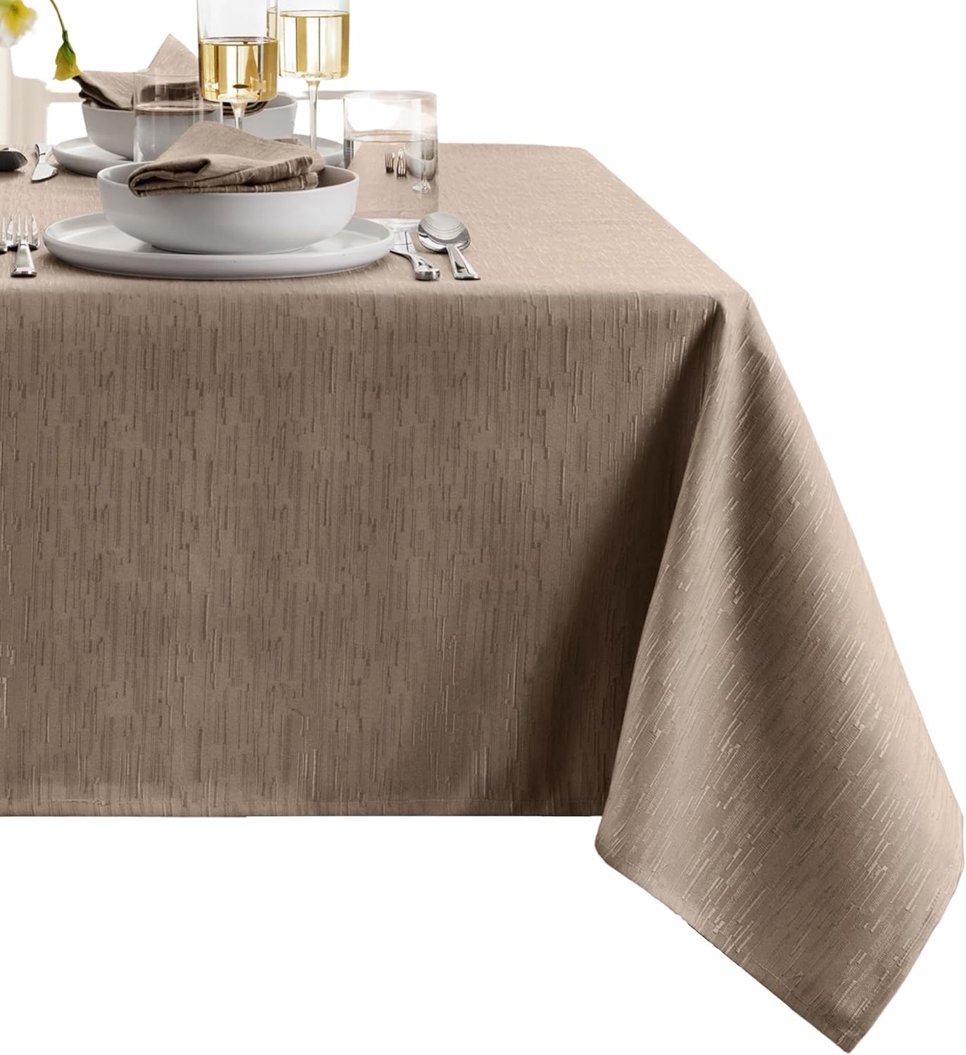 The Elrene Home Fashions Continental Solid Textured Water- and Stain-Resistant Tablecloth features a contemporary raised slub texture pattern in a variety of solid colors, making it ideal for every decor style. This tablecloth adds textural beauty and a transitional look to any tablescape, whether it’s a casual brunch, seasonal gathering, or formal holiday event.Made from high-quality 100% polyester for a beautiful drape, our heavyweight fabric features a water-resistant, stain-resistant, and fade-resistant finish to protect your table from scratches and accidental stains and spills. The fabric easily wipes clean with a damp cloth or sponge. The designer-quality hemmed edges add a tailored, finished look to modern and traditional table settings while preventing wear and tear. This refined table cover is available in a large selection of sizes and shapes, including rectangle, oval, and round, so you are sure to find the perfect fit for your everyday dining and year-round entertaining needs.Our tablecloth is easy to care for, machine washable, and dryer-safe for effortless upkeep. For a complete look, pair your tablecloth with our luxury table pad and matching Continental solid textured dinner napkins.