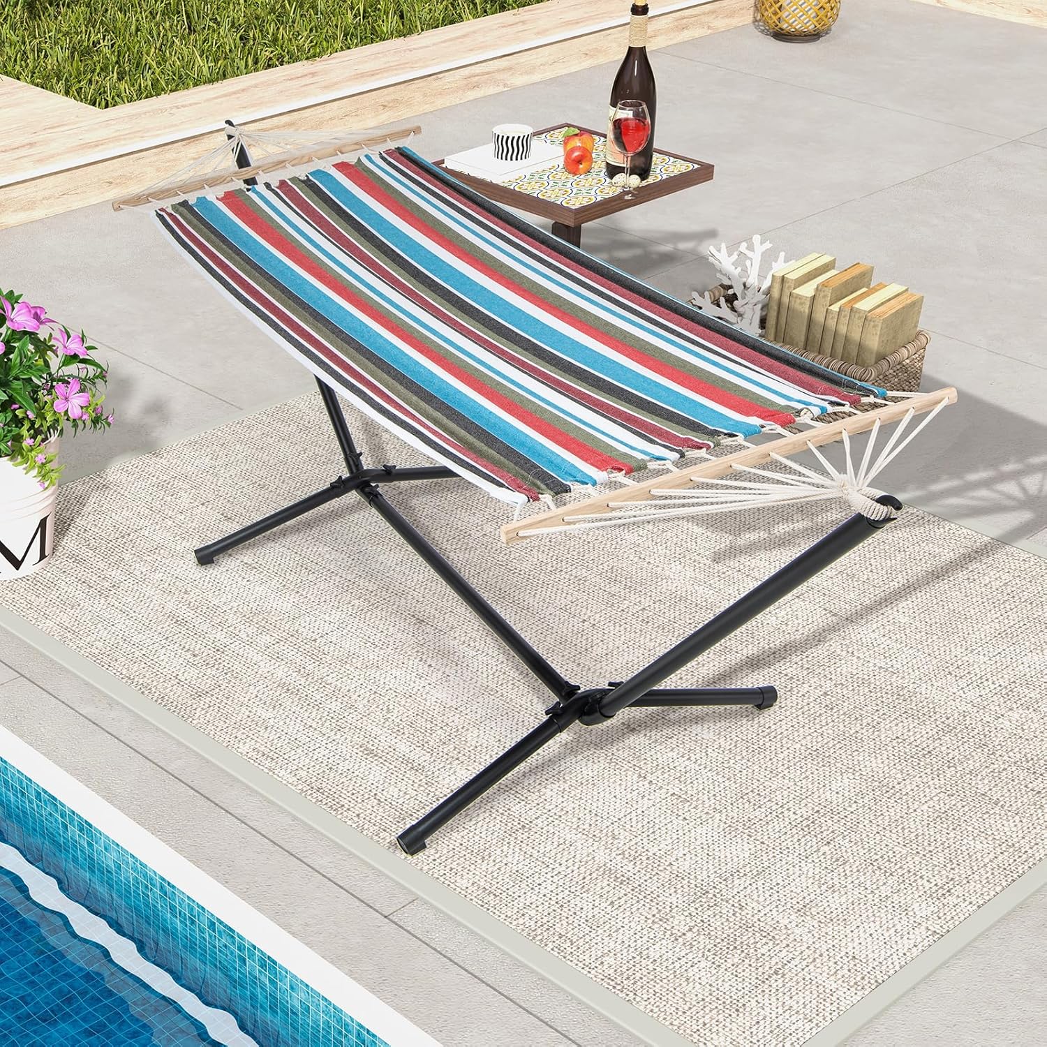 Description: Embrace the serenity and tranquility that comes with owning your personal oasis by lying on our hammock with stand! Our 10.5 ft heavy-duty stand provides a sturdy and dependable foundation for your outdoor oasis. Made from heavy-duty and rustproof metal, this stand ensures durability and stability, even under the weight of up to 330 lbs. You can rest assured that it will stand strong, allowing you to enjoy your hammock without any worries. Speaking of hammocks, our portable hammock is designed with your utmost relaxation in mind. The skin-friendly and breathable fabric provides unparalleled comfort. Whether you're lounging with a book, soaking up the sun, or taking an afternoon siesta, this hammock will be your cozy retreat. Don't let transportation hold you back thanks to the included carrying bag. Take your hammock anywhere from your garden to the beach or even on camping trips. The carrying bag brings ultimate convenience and protection, ensuring your hammock stays in pristine condition wherever you go. Features: Cradle you in a peaceful embrace with skin-friendly and breathable fabric Heavy-duty and rustproof metal stand for stability and durability Hold up to 330 lbs, recommended for one person Easy to carry and store thanks to the carrying bag Make the hammock more stable with hand-woven ropes and wood spreader bar Non-slip foot pads for ground protection and additional stability Convenient to assemble for labor-saving Suitable for garden, patio, backyard and more Specifications: Color: Multi-color Material: Metal, Poly-cotton, Wood Dimension of Swing Chair: 118” x 39” (L x W) Dimension of Stand: 126” x 39” x 38” (L x W x H) (L x W x H) Dimension of Storage Bag: 48” x 8” x 5.5” (L x W x H) (L x W x H) Net Weight: 27 lbs Weight Capacity: 330 lbs Package Includes: 1 x Stand 1 x Swing Chair 1 x Storage Bag 1 x Instruction