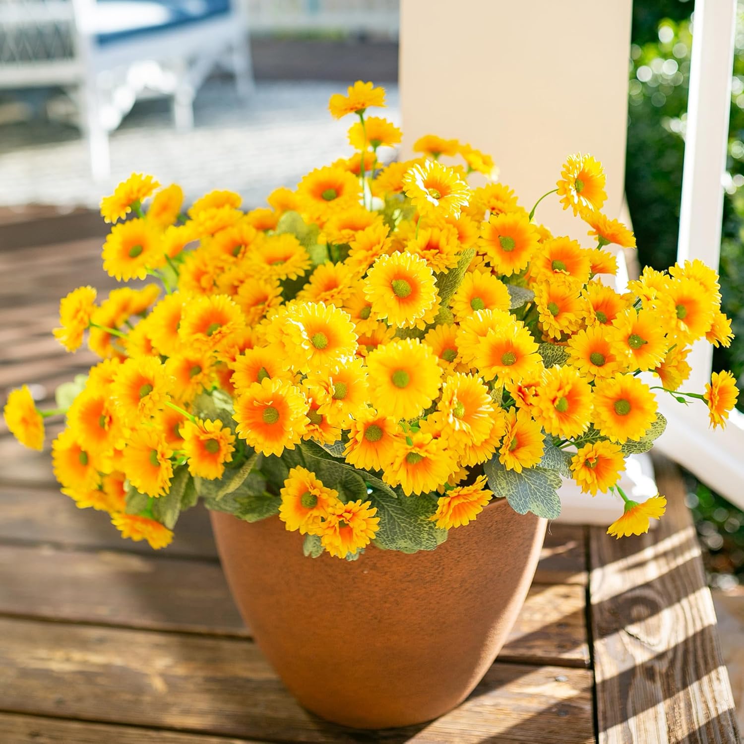6 Bundles Realistic Artificial Flowers: Includes 6 bundles of lifelike artificial daisy flowers (Pot not included). These vibrant faux flowers feature clear leaf veins and a natural texture that mimics real fresh flowers. Designed to bloom perpetually, the fake flowers instantly brighten up your living space and bring the joy of spring to your home all year round.