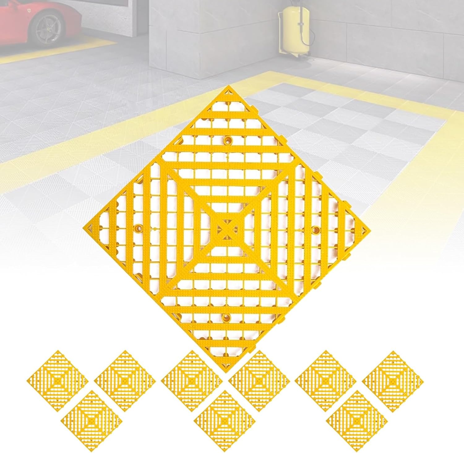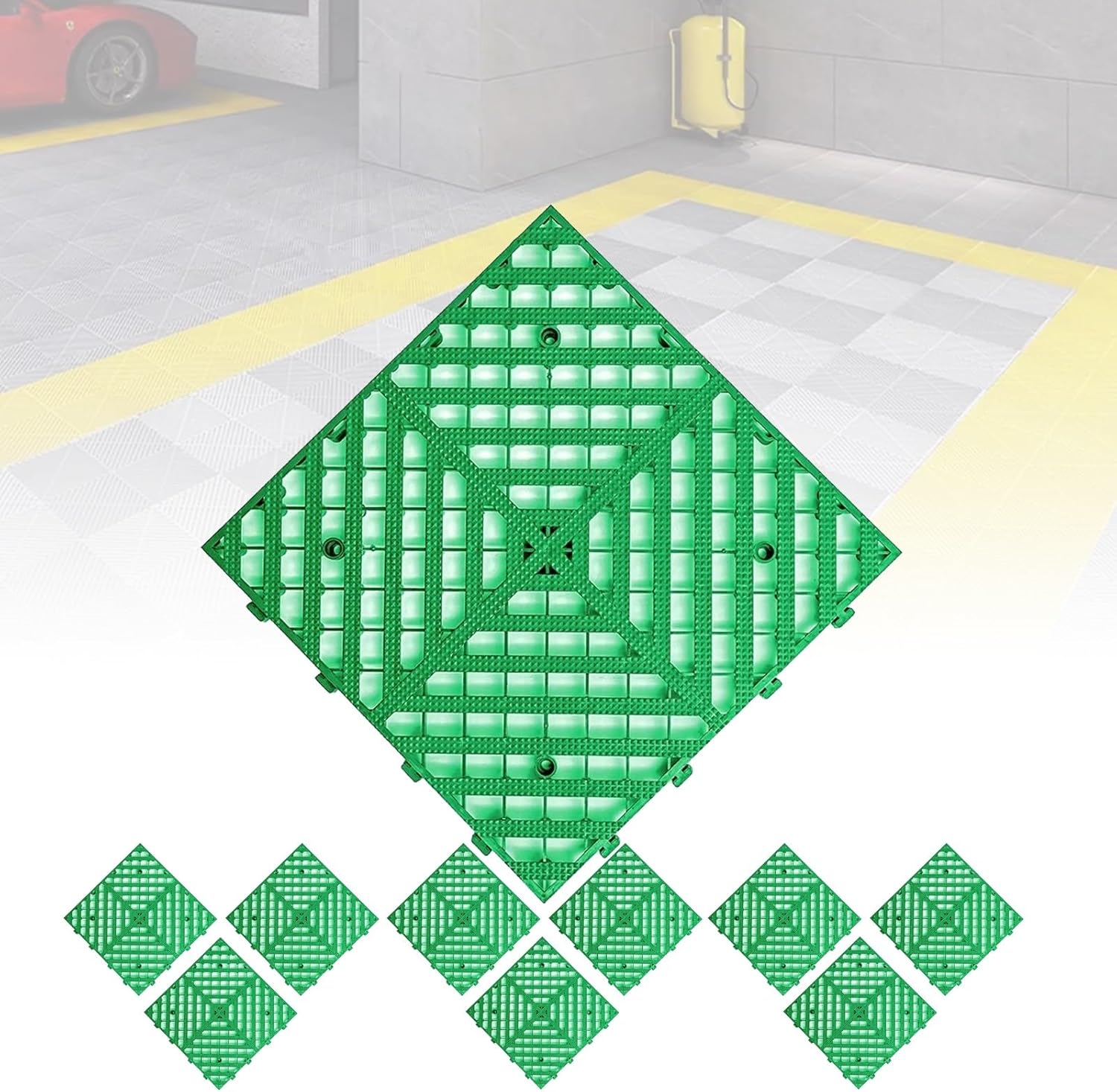 Interlocking flooring drainage tiles mat to prevent slipping and falling in wet, good flooring solution for pool, bathroom, pet and morePRODUCT FEATURES1. It is the best choice for any wet or slippery environment, With mesh hole design that is good drainage function.2.Durable, wear-resistant, can be free splicing and cutting, Prevent slipping, comfortable foot feeling.3. They snap together fine, simply snap the interlocking cushion floor tiles together and create the custom configurationPRODUCT SPECIFICATIONS:Product name: Drainage Interlocking Floor Tiles、Outdoor Modular Interlocking Floor Mat SystemProduct material: PVCProduct color: Black , Blue , Gray , Green , Red , YellowSize: 40*40cm/16*16inThickness: 3cm/1.2inType: InterlockingScope of application: car wash room, car beauty center, auto show, balcony,Garage,Laundry Room, Bathroom, Camper, Backyard, Trailer/RVLoad-bearing weight: which can bear the weight of automobiles and professional auto repair equipmentPACKING LIST:10*Drainage Interlocking Floor TilesTIPS:1. Please measure the length and width of the mounting position before purchasing2. Please allow the slight color difference caused by the shooting light and 1-3 cm error due to manual measurement, and make sure you do not mind before ordering.3. The package does not include the edge. If you need it, please contact us.NOTICE:If You Have Any Questions, Please Contact Us And We Will Provide A Satisfactory Solution Within 24 Hours