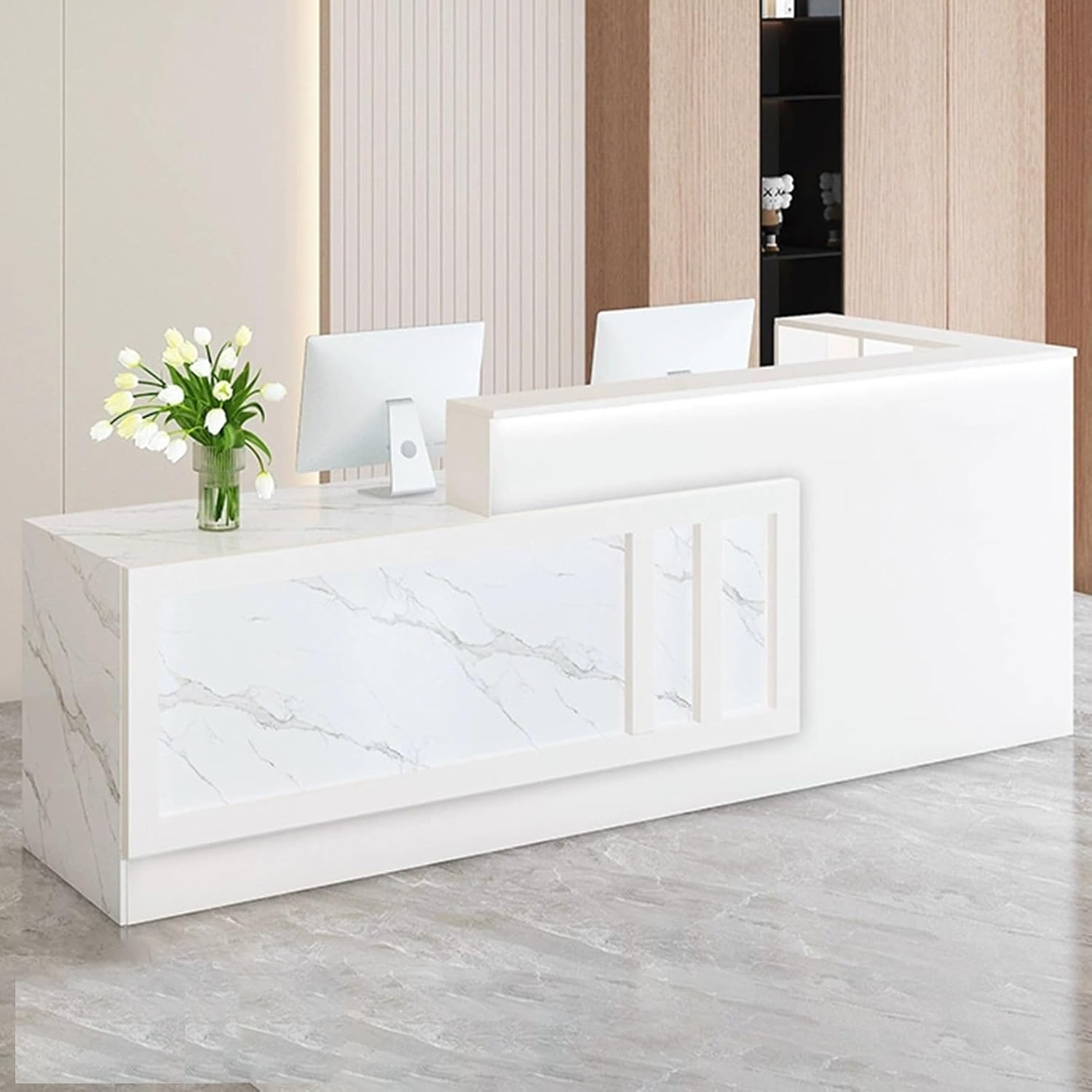 The lockable drawer is ideal to store your personal belongings and important files, it helps to protect privacyReception desk counter table The checkout counter design of the wrap-around side panels gives you an exclusive personal area,bringing a full sense of privacy and security,while also preventing your important files or bills from falling.Product name: Cashier, Reception Desk, Front Desk, Front Counter, Counter Desk, Reception Counter, Retail CounterProduct style: simpleProduct color: multiple colors availableProduct material: Artificial boardApplicable scenarios: clothing stores, beauty salons, etc.Product Size:L: 120cm/47.2in, 140cm/55.1inW: 60cm/23.6inH: 100cm/39.3inNotice:1. Note: Due to the particularity of the furniture, there will be slight errors in the finished product, which is normal. The data is for reference only and must be based on the actual product. We hope for your understanding!
