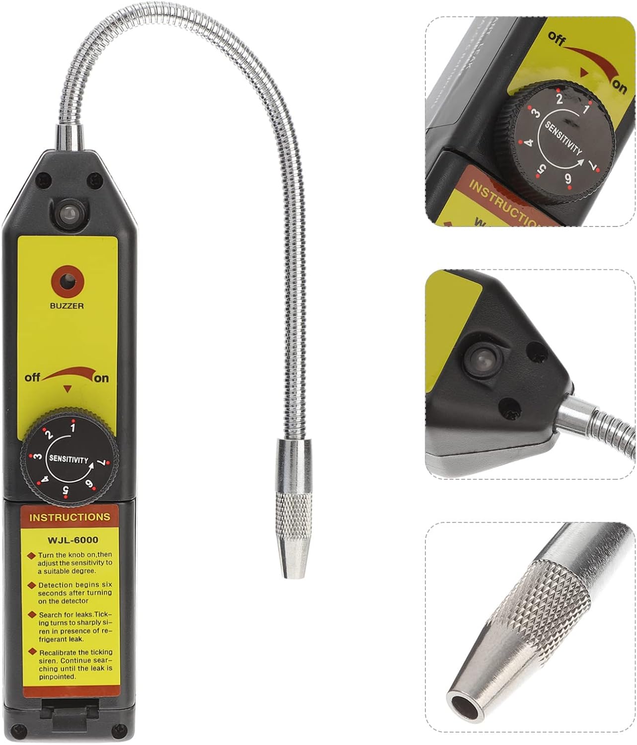 Description The leak detector is convenient and practical, with excellent texture, and without being easily damaged. The craftsmanship can serve you well without breaking easily. This is a very practical leak detector. Features- Color: Yellow;- Material: ABS;- Size: 9.00X2.55X2.55in; Working temperature: 0- 52 Celsius degree; Maximum sensitivity: For halogen , 6gr/; Warm- up time: about 6 seconds; Reset time: 2- 10 seconds; Power : 4 x AAA batteries ( not included ); Battery Life: About 50 hours under normal use; Response Time: Instantaneous; Mode: unlimited; Probe length: 20cm; Package Including 1 x leak detector