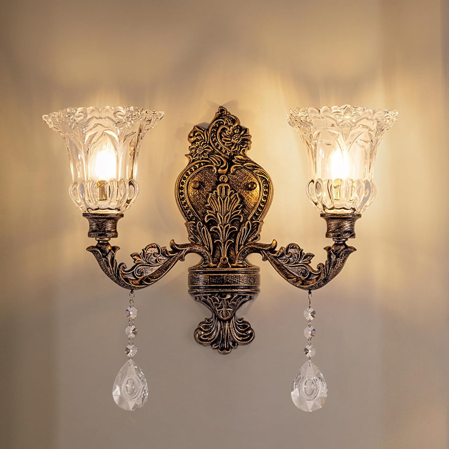 • Gold Wall Sconce: The body of the wall sconce is crafted with gold finish and the crystal glass shade creates a soft glow that adds luxury and texture to your bathroom vanity. Featuring beautiful and refined details, it is perfect for a variety of design styles from industrial to modern