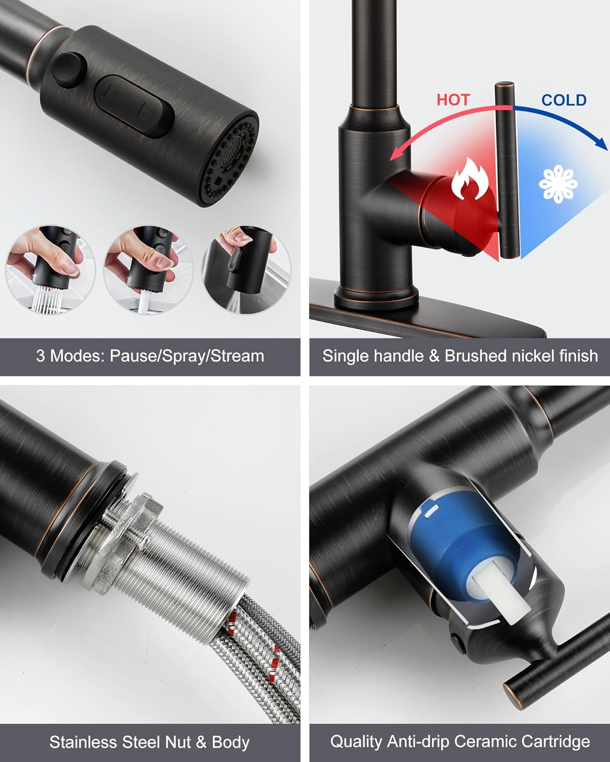 WOWOW Kitchen Faucet Head Replacement Oiled Rubbed Bronze, 3 Function Pull Out Spray and Kitchen Faucets with Pull Down Sprayer, Oil Rubbed Bronze Kitchen Faucet